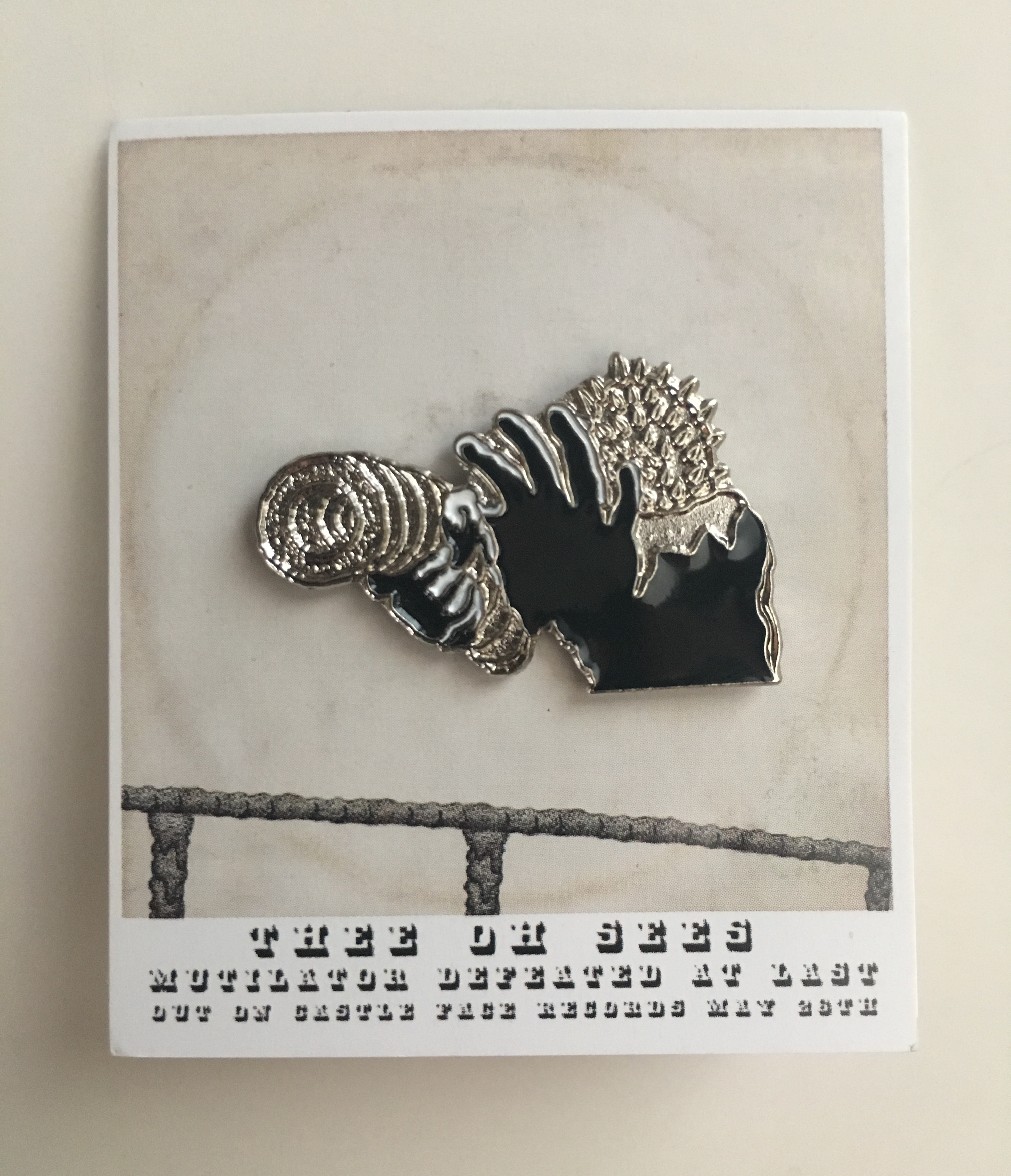 The long-awaited second installment in the Oh Sees enamel pin series, the Mutilator has arrived - to be defeated - at last. An album of detailed, refined yet still unforgivingly face-melting krautrock and psychedelia, Mutilator Defeated At Last serves as a turning point in the Oh Sees discography. Sludgy bass lines, soft and hushed, yet sometimes monstrous vocals, this album is a pivotal moment in the band's cataclysmic catalogue. Made with textured nickel to truly capture the source artwork by artist Tetsunori Tawaraya, and of course, with permission and full blessing by John Dwyer.