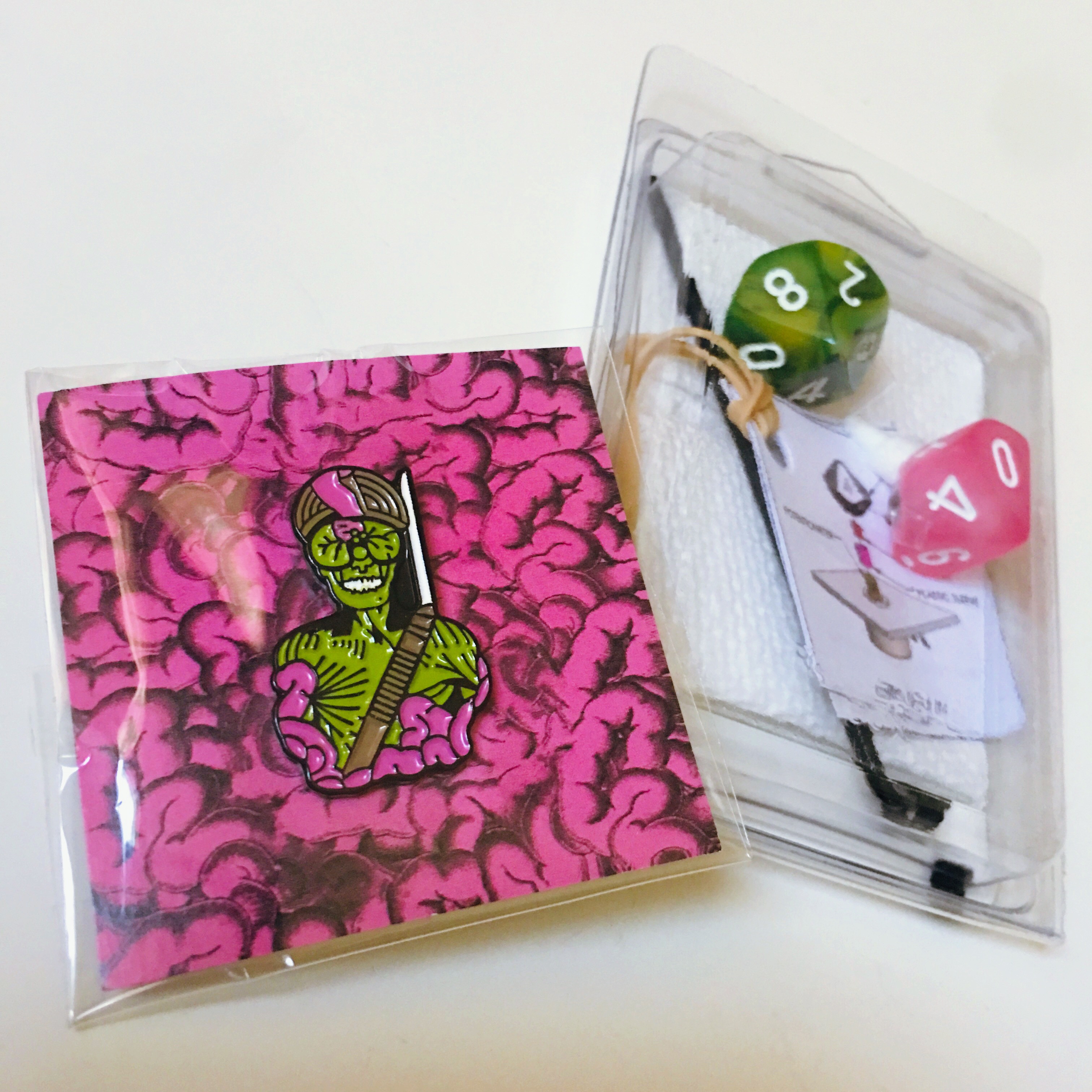 Known for his amazing work on the legendary dice guitar knobs of John Dwyer and Tim Presley and every fuzzed-out, role-playing riff-ripper in between, Opposed Action Initiative turns D8s, 12s, and 20s into tools for crowd domination. In collaboration with yours truly, we have worked together to bring you a limited edition of 20 deadly-duo set of a Carrion Crawler enamel pin and two Carrion Crawler inspired D10 knobs in Parietal Pink and Glossopharyngeal Green for your guitar, bass, amplifier, effects pedals, synths, and just about anything that can be knobbed! All green dice are unique in their swirls. Some resemble galaxies and some resemble dragon eyes. No two are alike.
