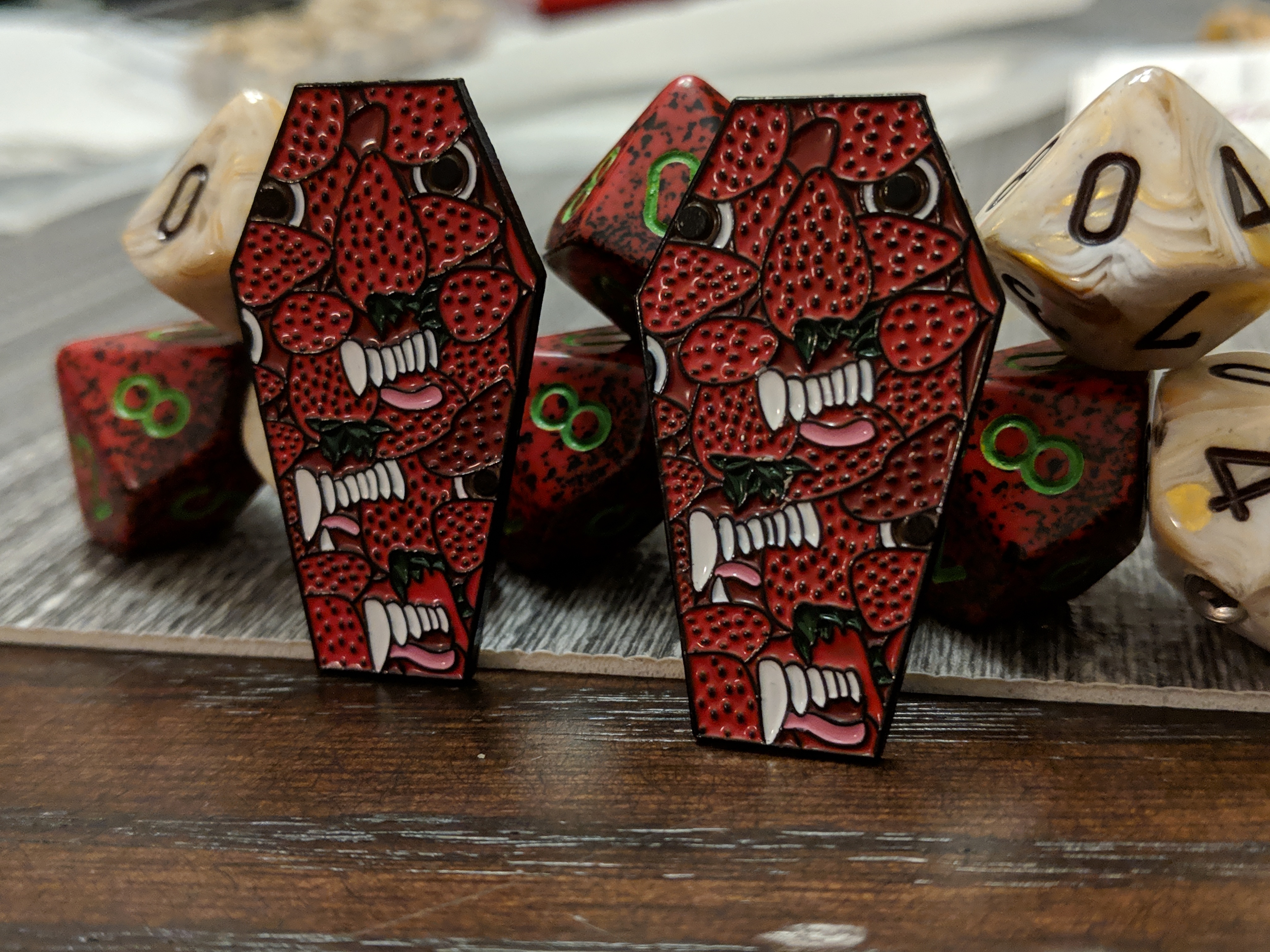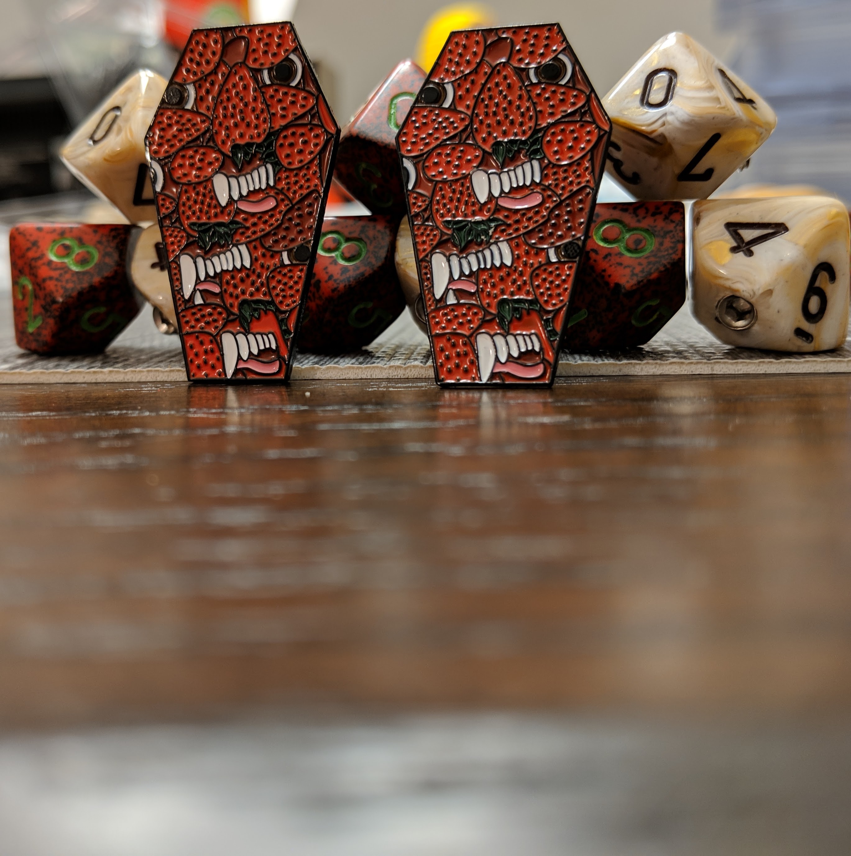 Opposed Action Initiative and Pins N' Needle have once again come together in holy matrimony to bring you a very special, limited edition Pin N' Knob set for Floating Coffin! Featuring two new colorways: Receptacle Red/Calyx Green and Bone Bronze/Dentin Decay Black, these two die perfectly reflect the vibrant colors of the strawberries and the fangs of the monstrous faces and are ready to be equipped onto your guitar, bass, amplifier, effects pedals, synths, and just about anything that can be knobbed! As before, each knob is unique in its pattern and swirling, so you can be sure your pair are unique!