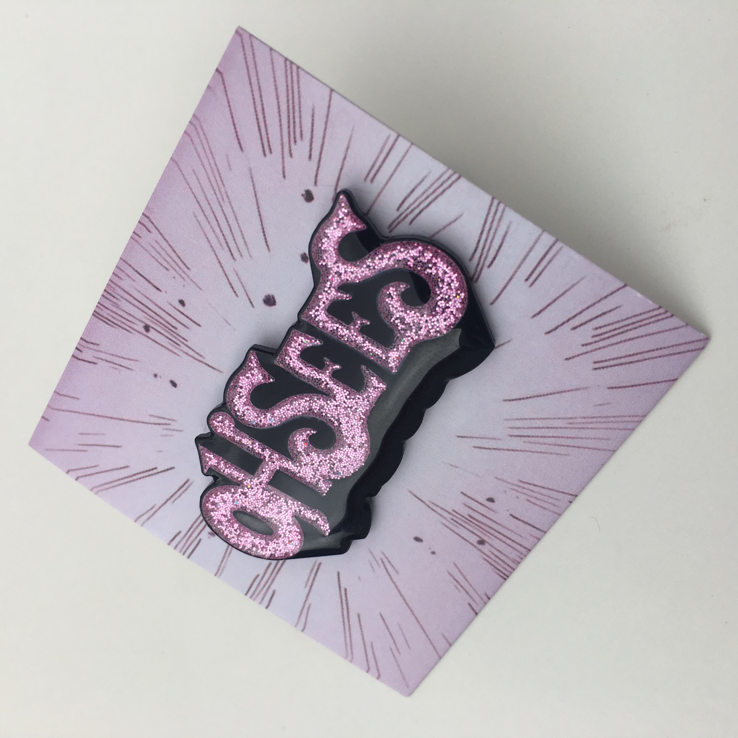 The highly requested repress of the 2009 Paul Cary/Oh Sees 7" logo is finally here in all its glistening and glimmering, glitter glory. This version two features a new pink glitter coating, black dye plating, and an epoxy resin to ensure the glitter stays on the pin and shining - all supported by the signature color-coordinated pink clutch.