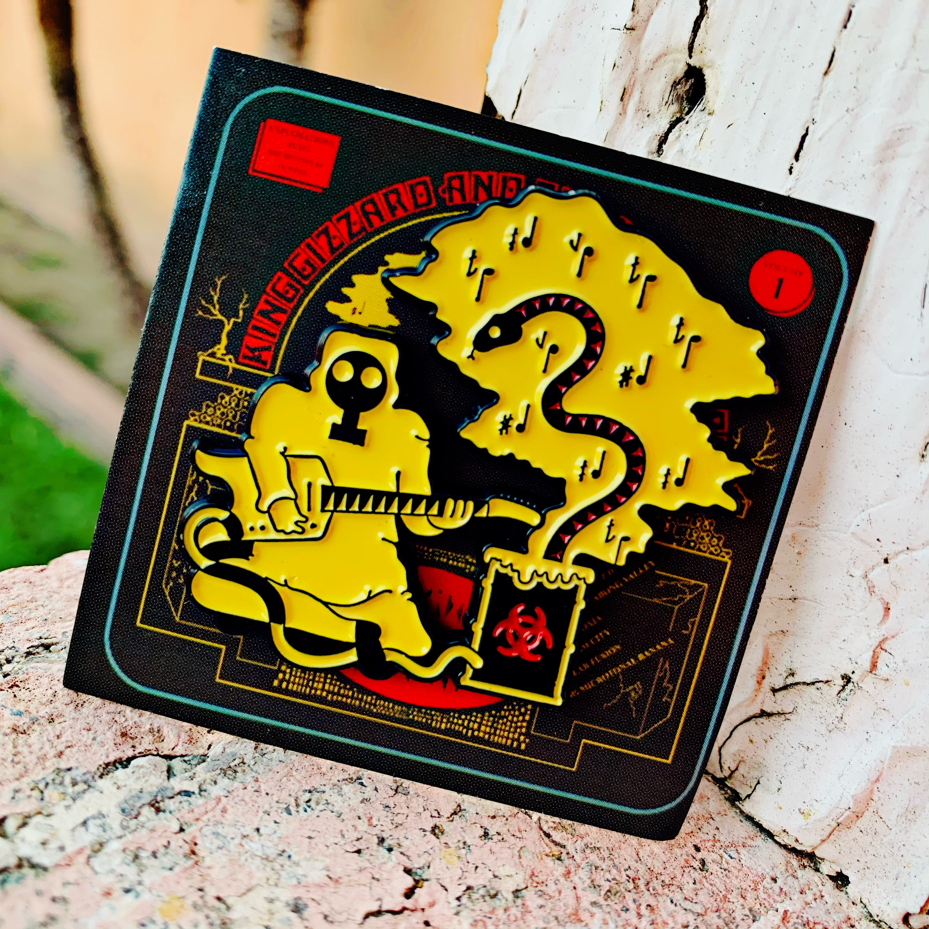Nuclear waste has transformed and transfigured the original Flying Microtonal Banana pin! This Version 2 boasts the yellow and red colorway of the limited alternate cover to FMB and is almost double the size of the original!